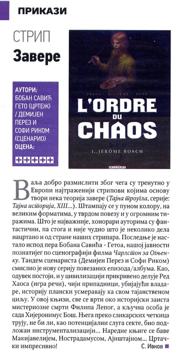 21/09/201421/06/2015 Art-Anima Boban Savić Geto, Demijen Perez, Sofi Rikom – RED HAOSA Piše: Slobodan Ivkov NIN br. 3189, strana 68. Datum 09.02.2012. Rubrika: SFstrip Povezani sadržaj:9. Festival fantastične književnosti Art-Anima 5. i…DOLAZAK HORORA – nova knjiga dr Dejana OgnjanovićaBeogradska promocija studije DOLAZAK HORORA (17.12.)O 27. broju ZNAKA SAGITE na Festivalu ART-ANIMADarku Tuševljakoviću svečano uručena NIN-ova nagradaObjavljen je novi dvobroj časopisa ATHANATIK